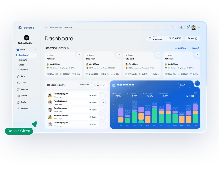 Customize your dashboard to fit your business. Track jobs, payments, and performance insights in one place, giving you a clear picture of your operations and your everyday results